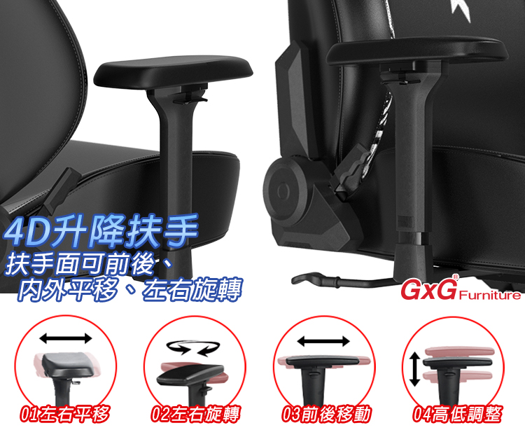 扶手可以高低升降,可以根據您使用偏好調整到適當的高度,扶手面可前後調整、內外平移、左右旋轉一段。