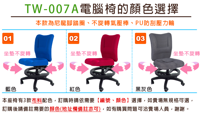 TW-007系列,皆為短背電腦椅,適合OA辦公室、小空間適用,搭配腳踏圈款式,更可當學齡兒童電腦椅使用,材質採用三明治透氣布料,透氣性好、快乾不易發霉,搭背成型泡棉護腰,給您超值舒適的座椅。