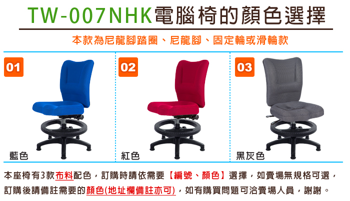TW-007系列,皆為短背電腦椅,適合OA辦公室、小空間適用,搭配腳踏圈款式,更可當學齡兒童電腦椅使用,材質採用三明治透氣布料,透氣性好、快乾不易發霉,搭背成型泡棉護腰,給您超值舒適的座椅。