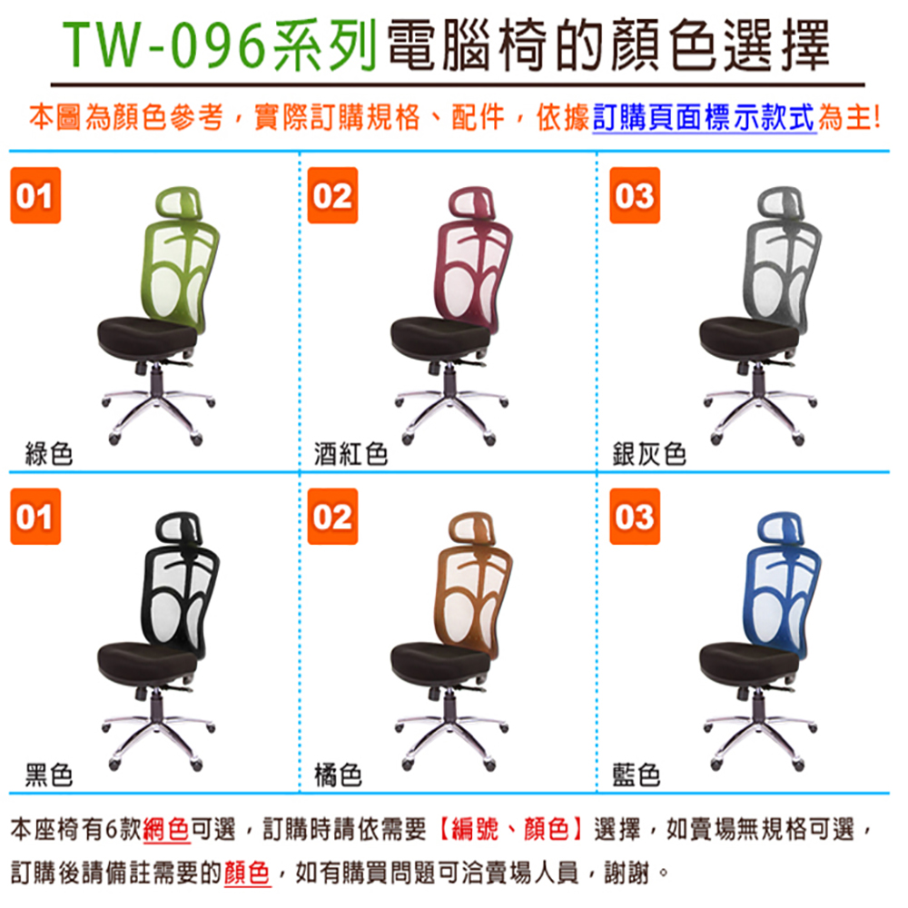 ※小提醒:本款 TW-096電腦椅,適合身高168-180CM的使用者;身高160CM以下使用者,有恐頭枕過高狀況,建議選購無頭枕款式,若有問題可先洽詢賣場客服 。