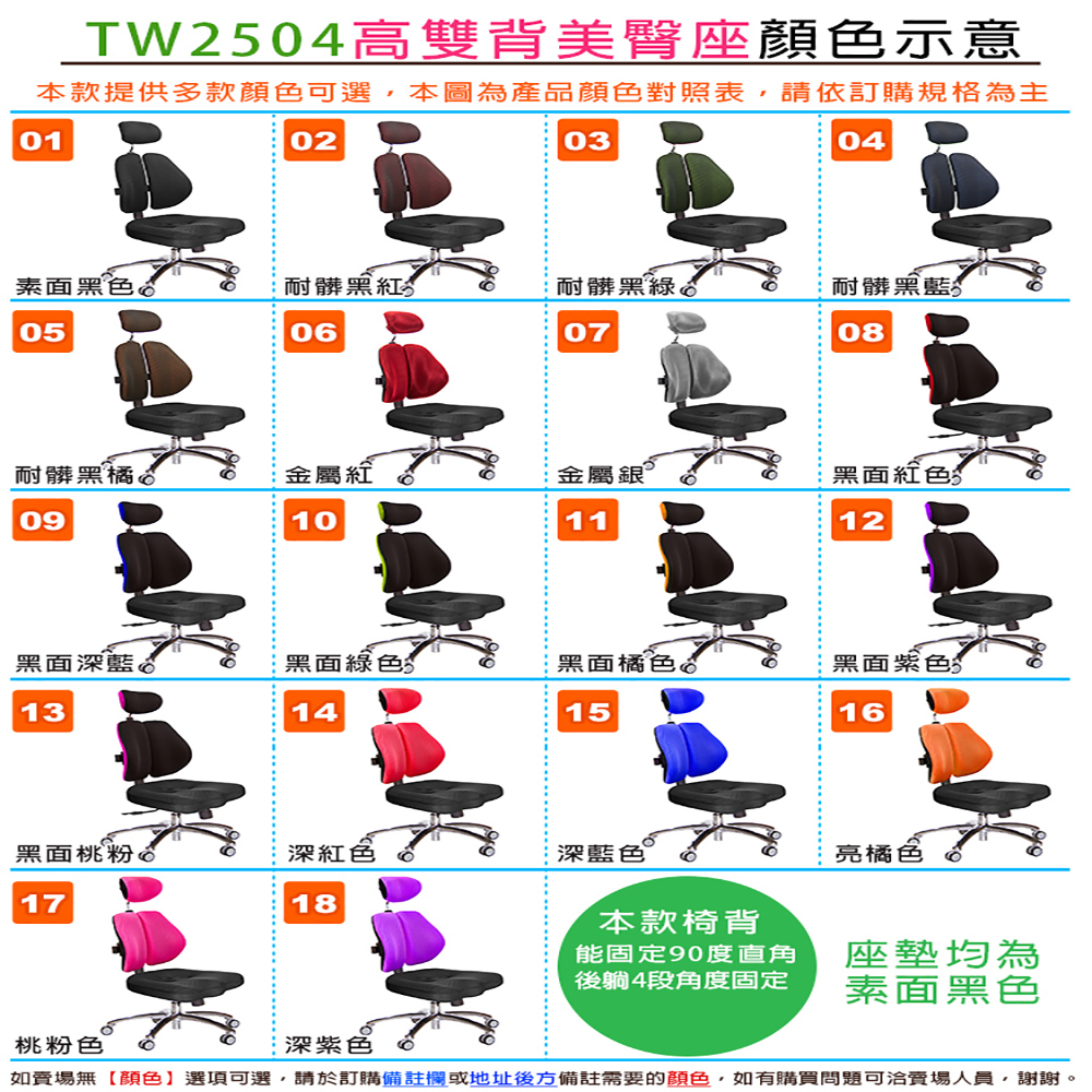 高背款 雙背椅 TW-2504LUA (耐髒黑藍色+泡棉枕)樣式示意