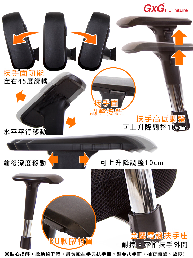 扶手面採用按鈕鎖定設計,按住按鈕可左、右旋轉1段、可左右平移、前後滑動;採用金屬抽套,扶手座高耐壓、高載重,適合習慣雙手支撐起身椅子的使用者 ,堅固耐撐,不怕扶手座外擴、變形,符合歐美國際標準。