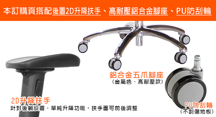 本訂購頁規格:後置2D升降滑面扶手、鋁合金腳座、PU防刮滑輪