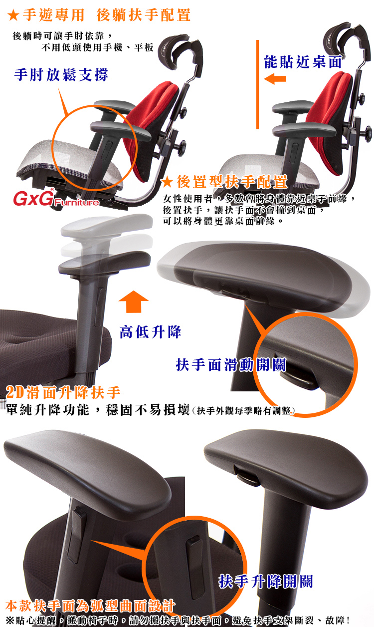 本款搭配HR-003升降扶手, 後置扶手設計,針對大多數女性使用者,喜歡將身體靠近桌面,一般扶手為前置,較容易撞到桌面,後置扶手可以避免撞到桌面,將身體更貼近桌面前源,後躺時,能讓手肘輕鬆後靠,閱讀書籍、使用平板手機,更輕鬆舒適。
