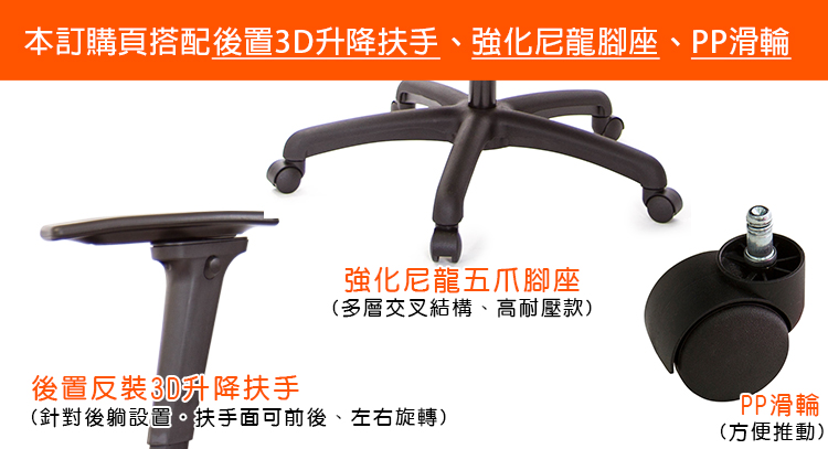本訂購頁規格:後置3D升降扶手、尼龍腳座、PP滑輪