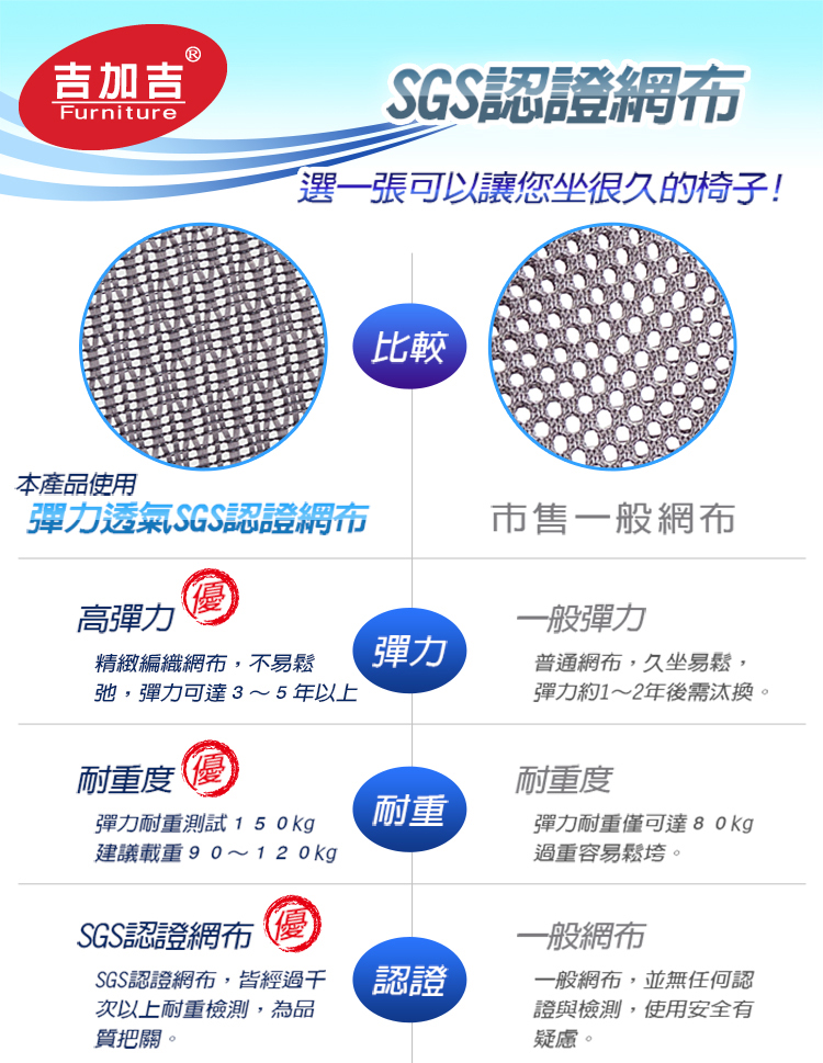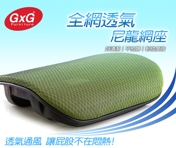 『座墊』採用國際SGS認證尼龍網布,全網透氣的材質,能讓臀部久座不悶熱,全網座墊使用日本技術繃法,採用三反折手工編織,讓坐墊能使用5~6年以上都不易鬆垮,尼龍絲編製的全網,不吸水的特性,不易髒汙,整理清潔都相當方便。
