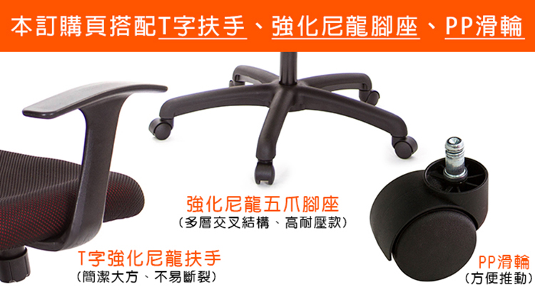 T字造型扶手,為最簡易實用的扶手,讓您休息好靠手,或是幫助移動椅子也很方便,扶手採用尼龍PP成行射出,安全、不易斷裂,符合歐美國際標準,可配合辦公環境需求,將扶手拆除也相當簡易。