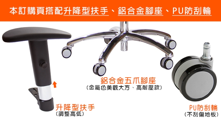 本款選用HR-301升降扶手,可調整扶手高低,扶手根座採用金屬鐵件抽套,扶手座高耐壓、高載重,適合習慣雙手支撐起身椅子的使用者,安全、不易斷裂,符合歐美國際標準。