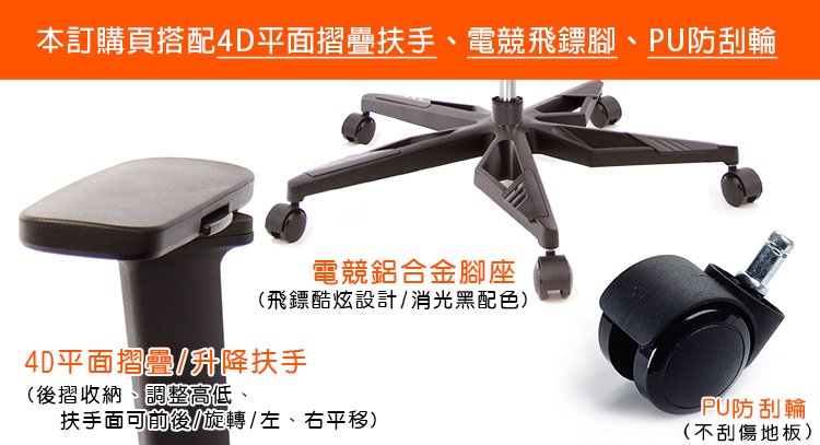 本訂購頁規格:4D"平面"摺疊/升降扶手、電競飛鏢黑鋁腳、PU防刮滑輪