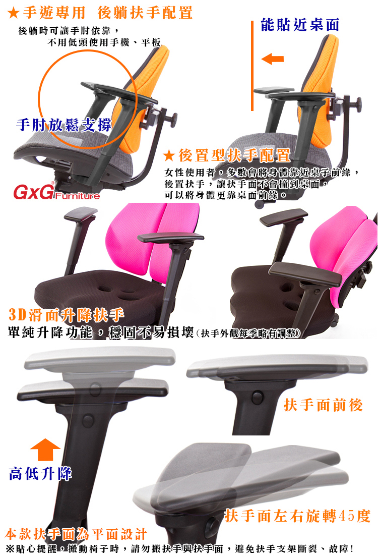 扶手面可左右旋轉、前後滑動,向後推到底,可固定扶手不轉動,扶手根座採用尼龍材質,高耐壓載重,適合習慣雙手支撐起身椅子的使用者,安全、不易斷裂,符合歐美國際標準,可配合 空間需求,將扶手拆除也相當簡易。