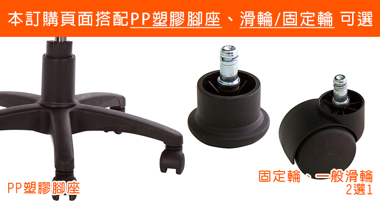 本款有兩種輪組可選,訂購前請注意,左圖為PP固定輪(不會滑動,輪子為平面),右圖為一般PP滑輪(可推動,學齡孩童為了安全,建議選擇固定輪,避免孩童上下椅子時,椅子滑動造成摔倒。