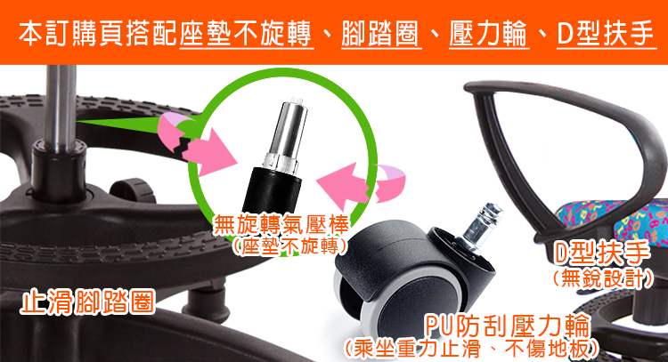 【腳踏圈】 針對學齡孩童身高不足,腳踏圈主要用途讓孩童好上下椅子,在書桌前面學習,能將腳踏上踏圈,不會讓腳懸空,增加乘坐穩定度,讓孩子更專心學習。