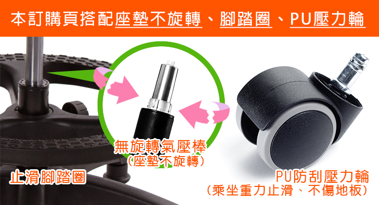 本款使用『PU壓力輪』:椅子在乘坐時,輪子會因重量下壓,止滑不易滑動;