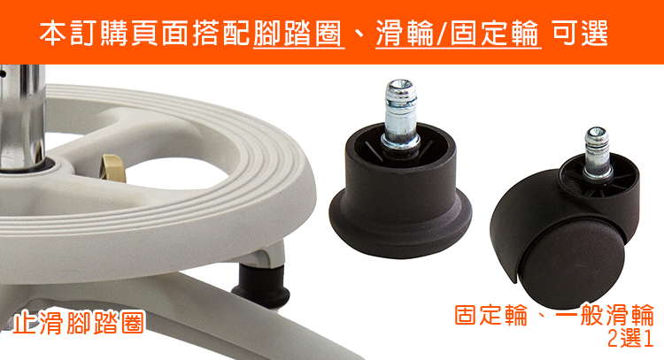 本款有兩種輪組可選,訂購前請注意,左圖為PP固定輪(不會滑動,輪子為平面),右圖為一般PP滑輪(可推動,學齡孩童為了安全,建議選擇固定輪,避免孩童上下椅子時,椅子滑動造成摔倒。