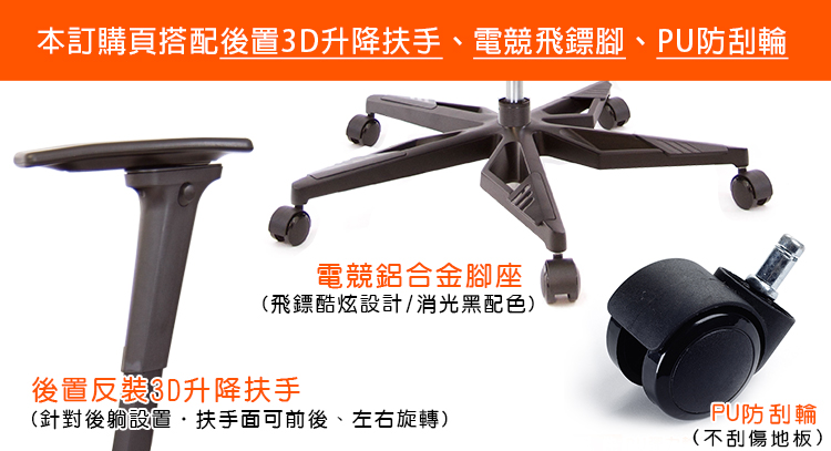 本訂購頁規格:後置3D升降扶手、電競飛鏢黑鋁腳、PU防刮滑輪