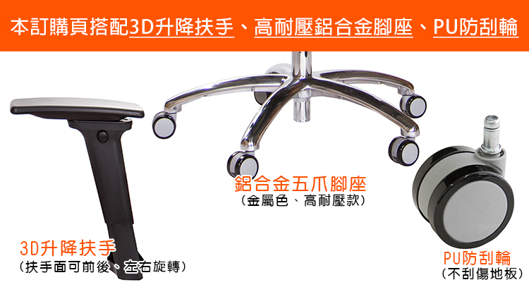 本訂購頁規格:3D升降扶手、鋁合金腳座、PU防刮滑輪
