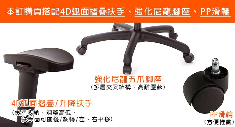 本訂購頁規格:4D"弧面"摺疊/升降扶手、尼龍腳座、PP滑輪