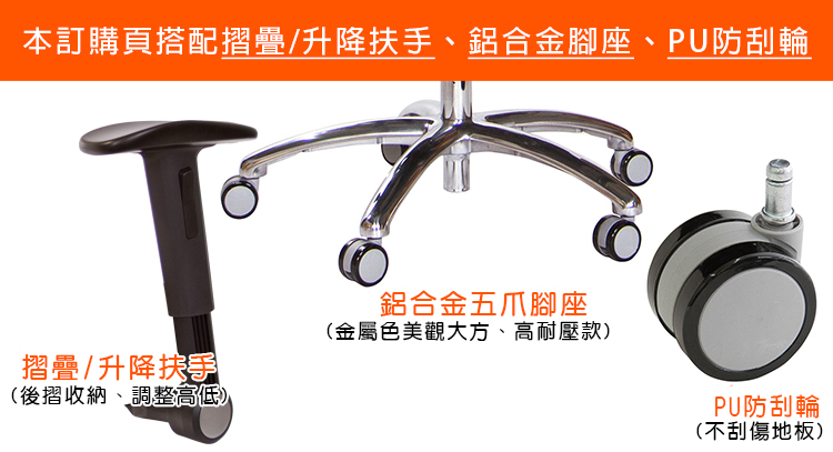本訂購頁規格:摺疊升降扶手、鋁合金腳座、PU防刮滑輪