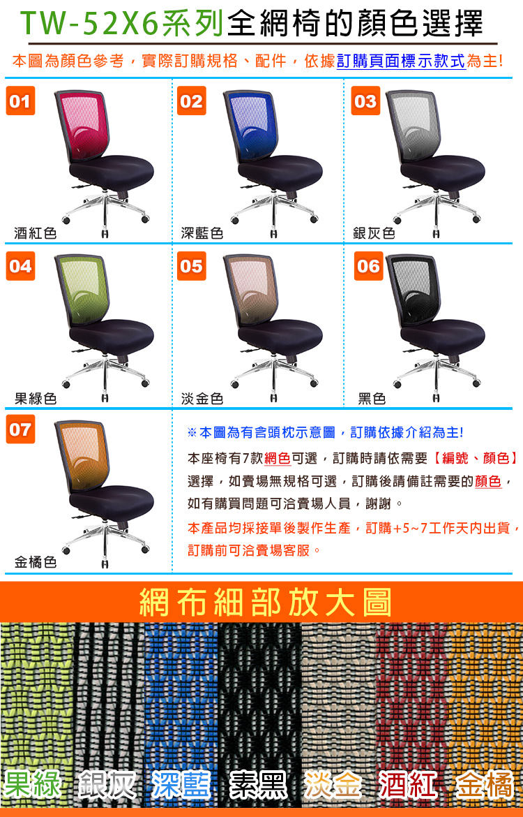 TW-52X6  短背半網電腦椅,椅背採用台灣製造SGS認證特網,使用尼龍纖維絲,不吸汗水、好清潔;配上重量級大座墊,給你滿滿大平台的乘坐空間。