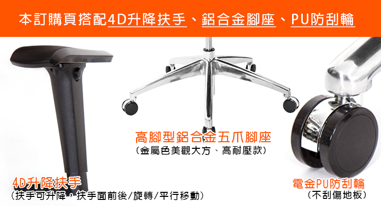 本訂購頁規格:4D升降扶手、山形鋁合金腳、PU防刮輪