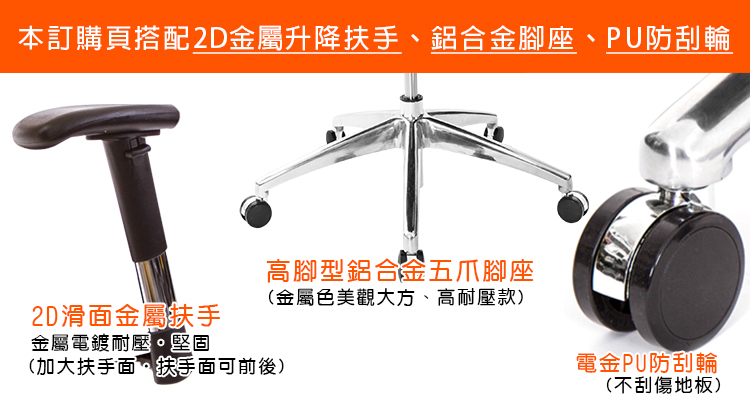 本訂購頁規格:2D滑面金屬扶手、山形鋁合金腳、PU防刮輪