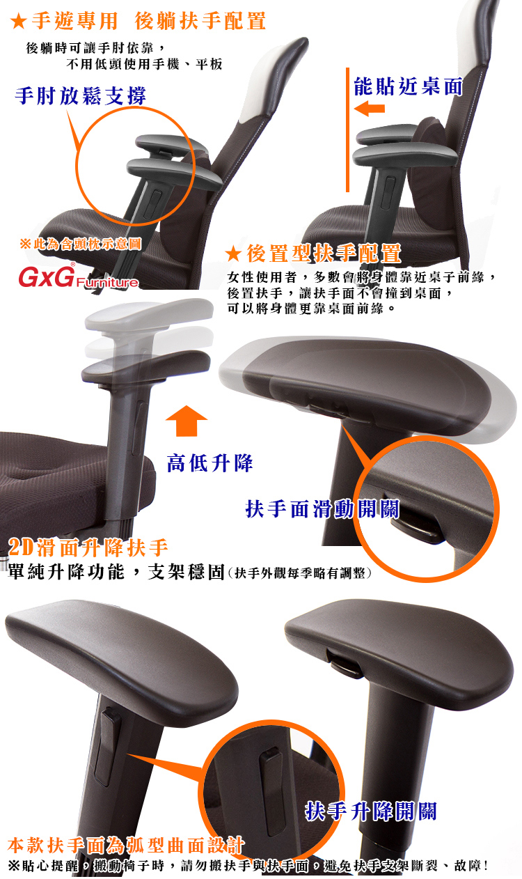 本款搭配HR-003升降扶手, 後置扶手設計,針對大多數女性使用者,喜歡將身體靠近桌面,一般扶手為前置,較容易撞到桌面,後置扶手可以避免撞到桌面,將身體更貼近桌面前源,後躺時,能讓手肘輕鬆後靠,閱讀書籍、使用平板手機,更輕鬆舒適。