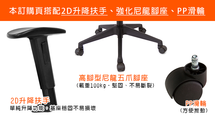 本訂購頁規格:2D升降扶手、尼龍高腳座、PP滑輪
