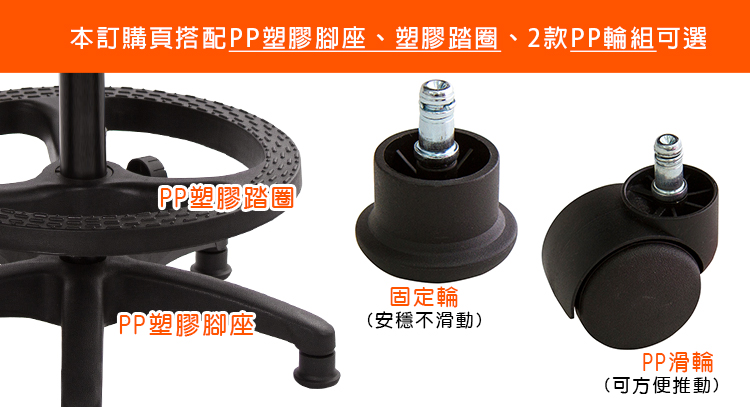 本款有兩種輪組可選,訂購前請注意,左圖為固定輪(不會滑動,輪子為平面),右圖為一般PP尼龍輪(可推動)。