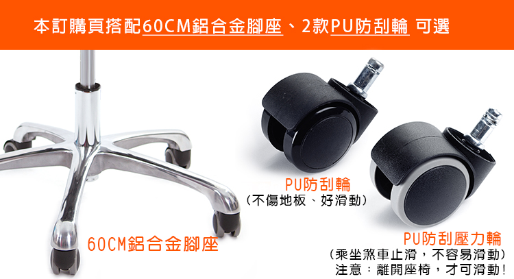 『PU壓力輪』:椅子承重時,輪面會因重量下壓固定"不滑動";椅面沒有重量時,保有『一般滑輪』作用方便滑動,不傷地板。