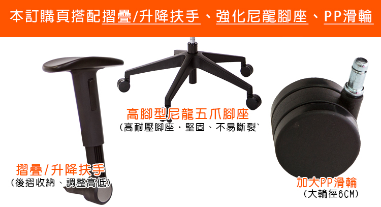 本訂購頁規格:升降折疊扶手、尼龍高腳座、PP滑輪
