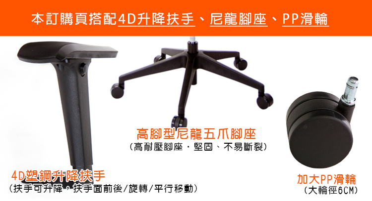 本訂購頁規格:4D升降扶手、尼龍高腳座、PP滑輪