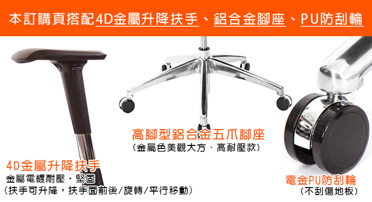 本訂購頁規格:4D金屬升降扶手、鋁合金腳座、PU防刮輪