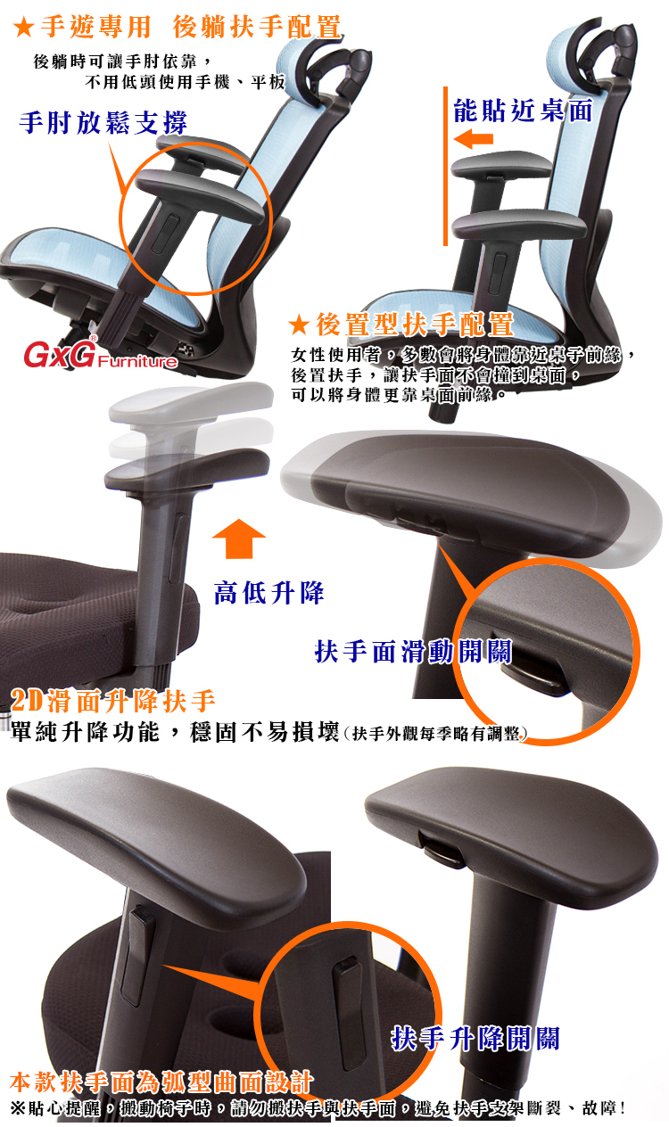 本款搭配HR-003升降扶手, 後置扶手設計,針對大多數女性使用者,喜歡將身體靠近桌面,一般扶手為前置,較容易撞到桌面,後置扶手可以避免撞到桌面,將身體更貼近桌面前源,後躺時,能讓手肘輕鬆後靠,閱讀書籍、使用平板手機,更輕鬆舒適。