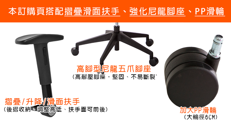 本訂購頁規格:摺疊升降/滑面扶手、尼龍高腳座、PP滑輪