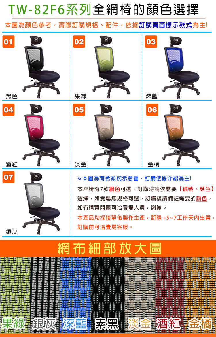 TW-82F6 高背半網電腦椅,椅背採用台灣製造SGS認證特網,使用尼龍纖維絲,不吸水、好清潔;配上重量級大座墊,給你滿滿大平台的乘坐空間。