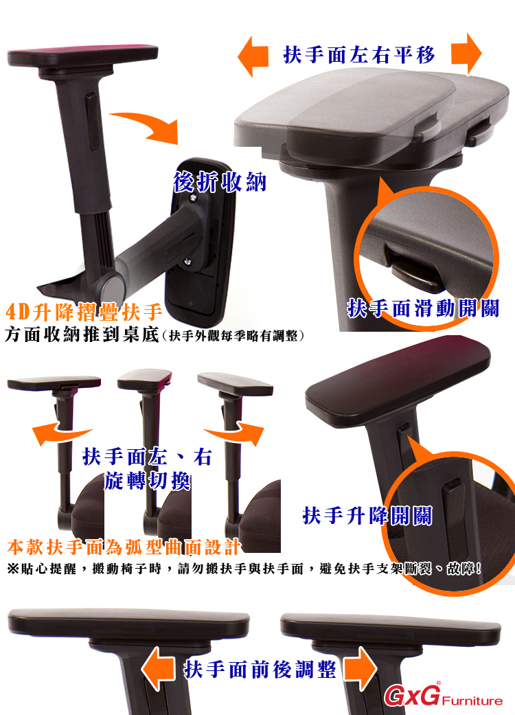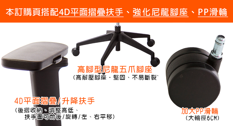 本訂購頁規格:4D平面升降折疊扶手、山形尼龍腳座、PP滑輪