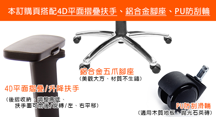 本訂購頁規格:4D平面升降折疊扶手、鋁合金腳座、PU防刮輪