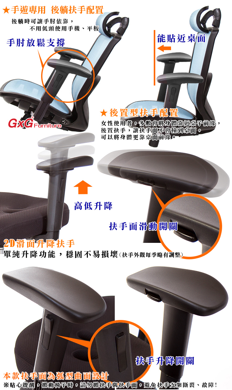 本款搭配HR-003升降扶手, 後置扶手設計,針對大多數女性使用者,喜歡將身體靠近桌面,一般扶手為前置,較容易撞到桌面,後置扶手可以避免撞到桌面,將身體更貼近桌面前源,後躺時,能讓手肘輕鬆後靠,閱讀書籍、使用平板手機,更輕鬆舒適。
