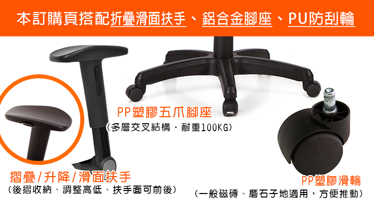 本訂購頁規格:摺疊升降/滑面扶手、PP塑膠腳座、PP滑輪