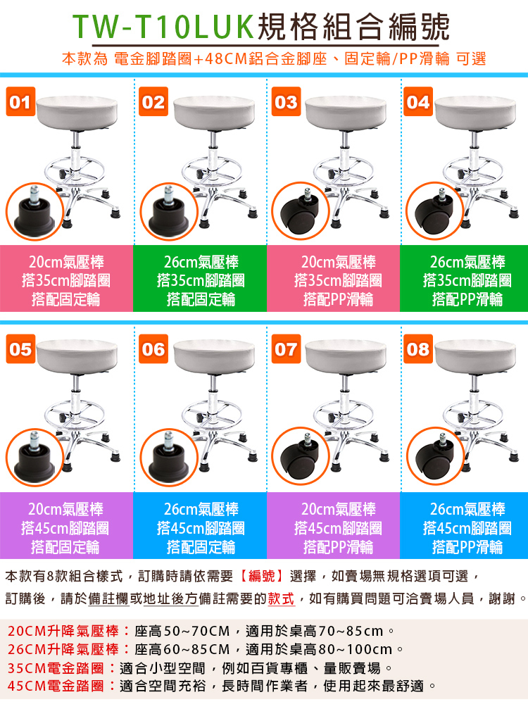 本款有兩種輪組可選,訂購前請注意,固定輪(不會滑動,輪子為平面),一般PP尼龍輪(可推動,若工作環境為木質、大理石地板,建議加購升級PU輪、或至五金百貨店買腳座布套,避免地板刮傷)。