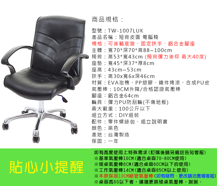 ※若需求較高座面高度,建議加長氣壓棒尺寸,