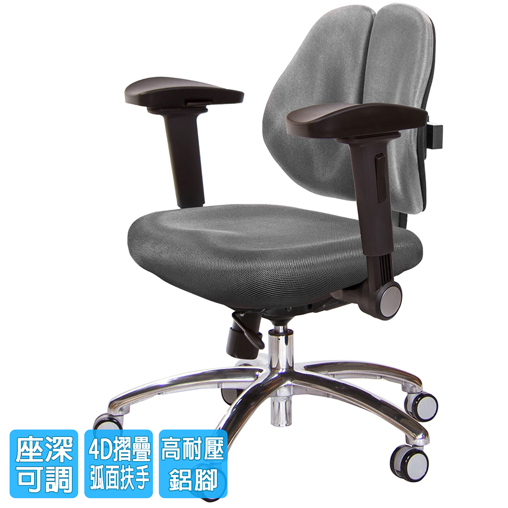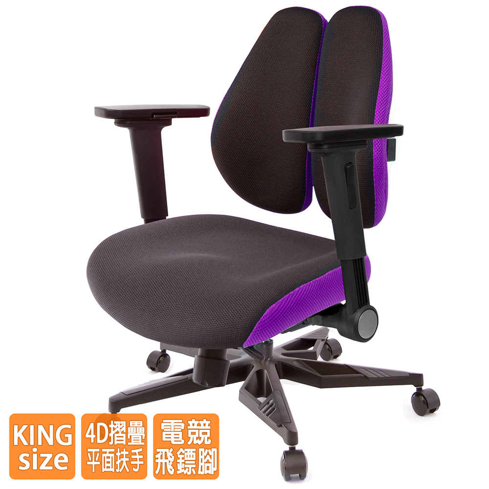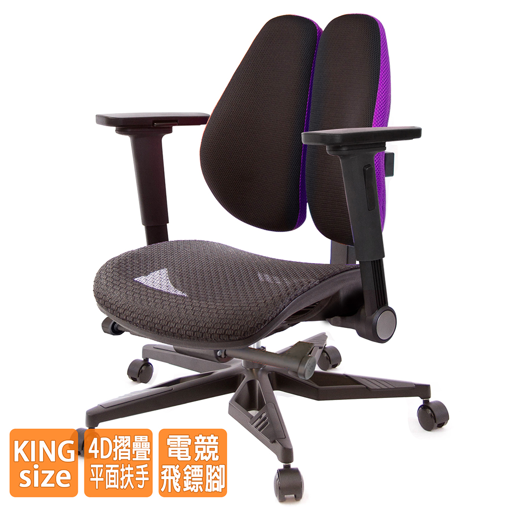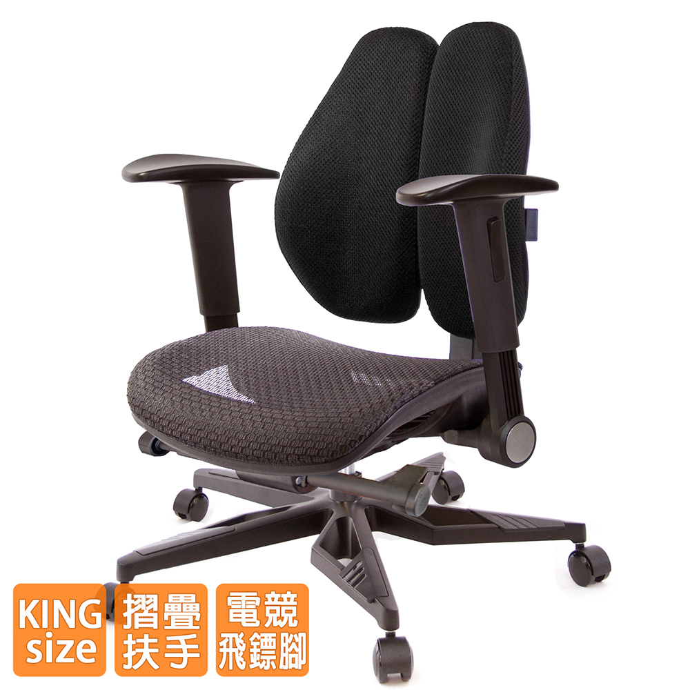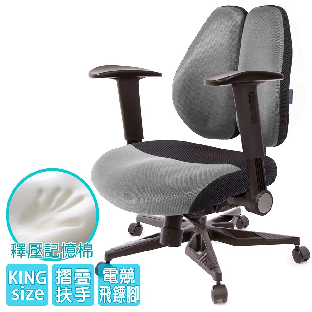 人體工學雙背設計,改善長時間座在椅子上,覺得腰部貼合度不足,有懸空或不夠沉穩的感覺,改良式的雙背背墊,除了完整包覆性外,更提供了『左右彈性』、『上下貼合』、『彈力緩衝』等特性,並有多國國際結構專利認證(台灣、德國、日本、美國、中國等),原廠專利、技術100% Made in Taiwan台灣製造。
