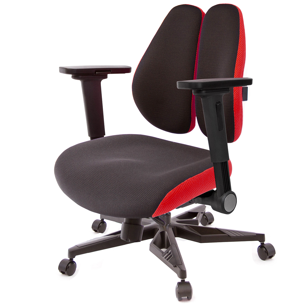 一般的電腦椅,實際上『椅背』大都不能支撐人體腰椎,緣自於人體本身的構造,人體的肩胛骨兩旁延伸至肩膀,其雙肩的壓力,會集中到腰椎中心處形成一個『倒三角的點』,如同一個箭頭向下將壓力壓迫到腰椎,無法讓脊椎肌肉正常釋放重力。 GXG Furniture開發出新式『智慧雙背椅』,提倡健康座、舒適生活,當您坐在一般椅子上,腰椎基本所承受的壓力,是人體自然站立時的140%,而使用『雙背智慧椅』,如同多了一雙手,完整托住您的背部,明顯比一般椅子減輕百分之五十的腰椎壓力,讓腰椎壓力降至75%,改善您長久以來的困擾怎麼坐,都痠痛的問題,能讓您舒適度明顯提升
