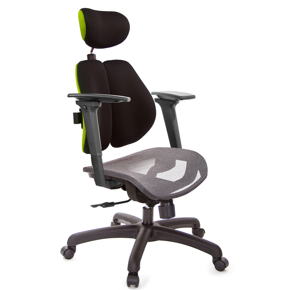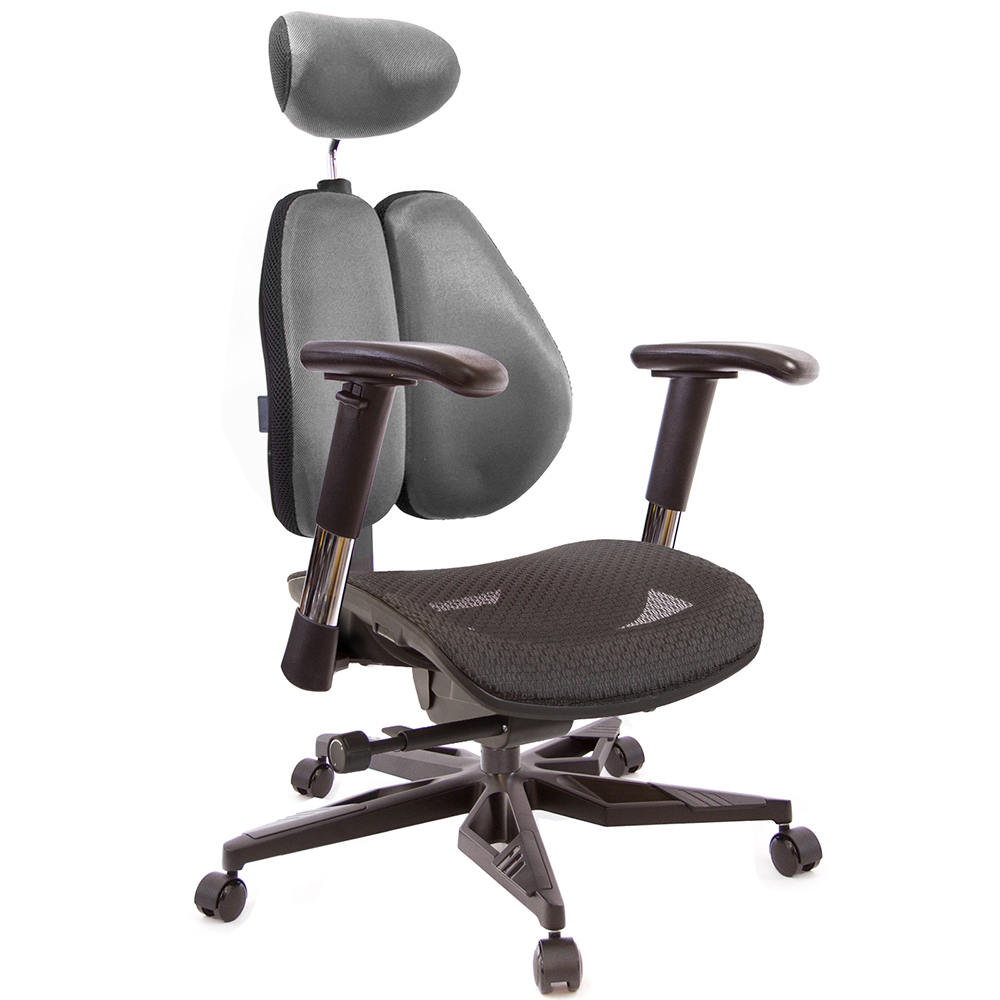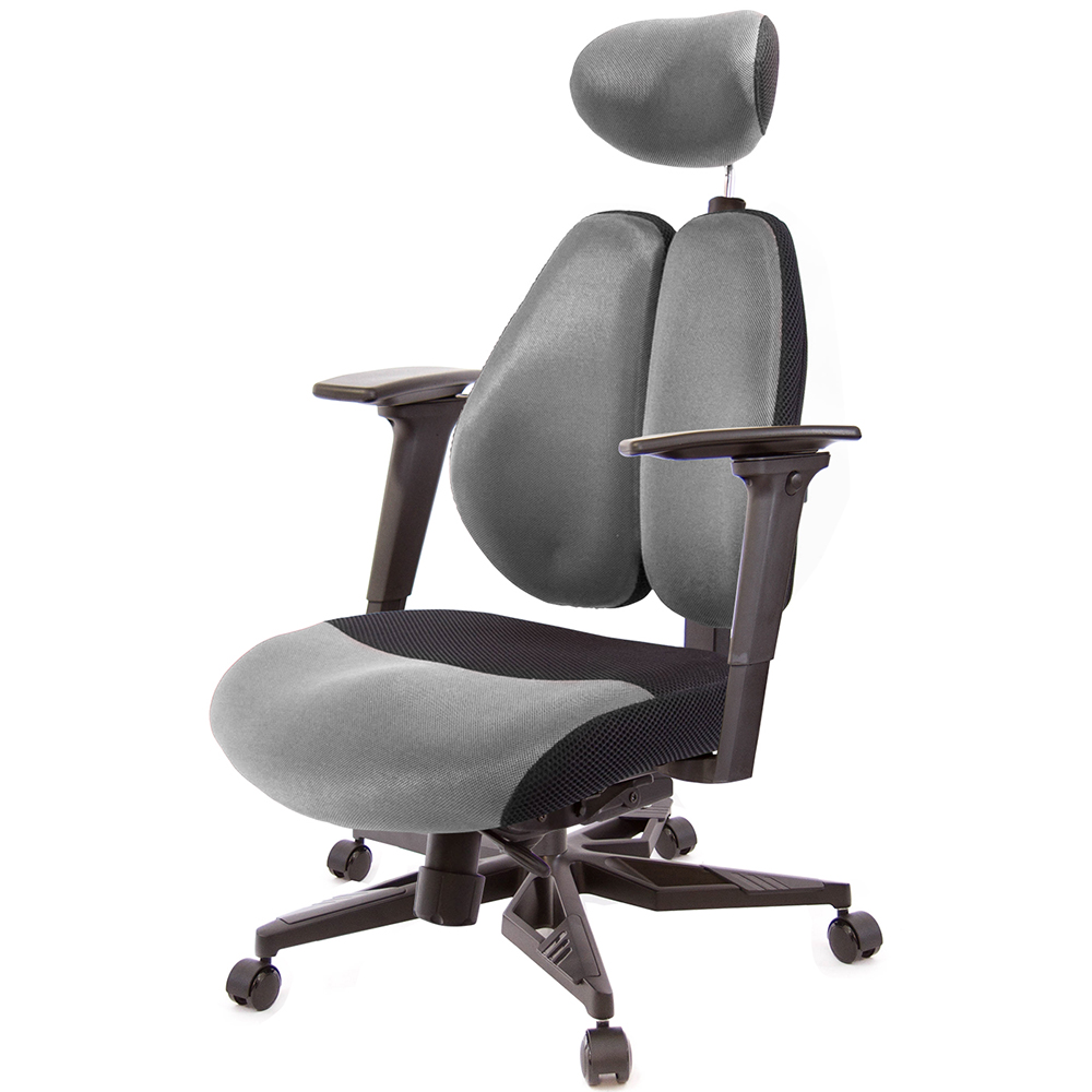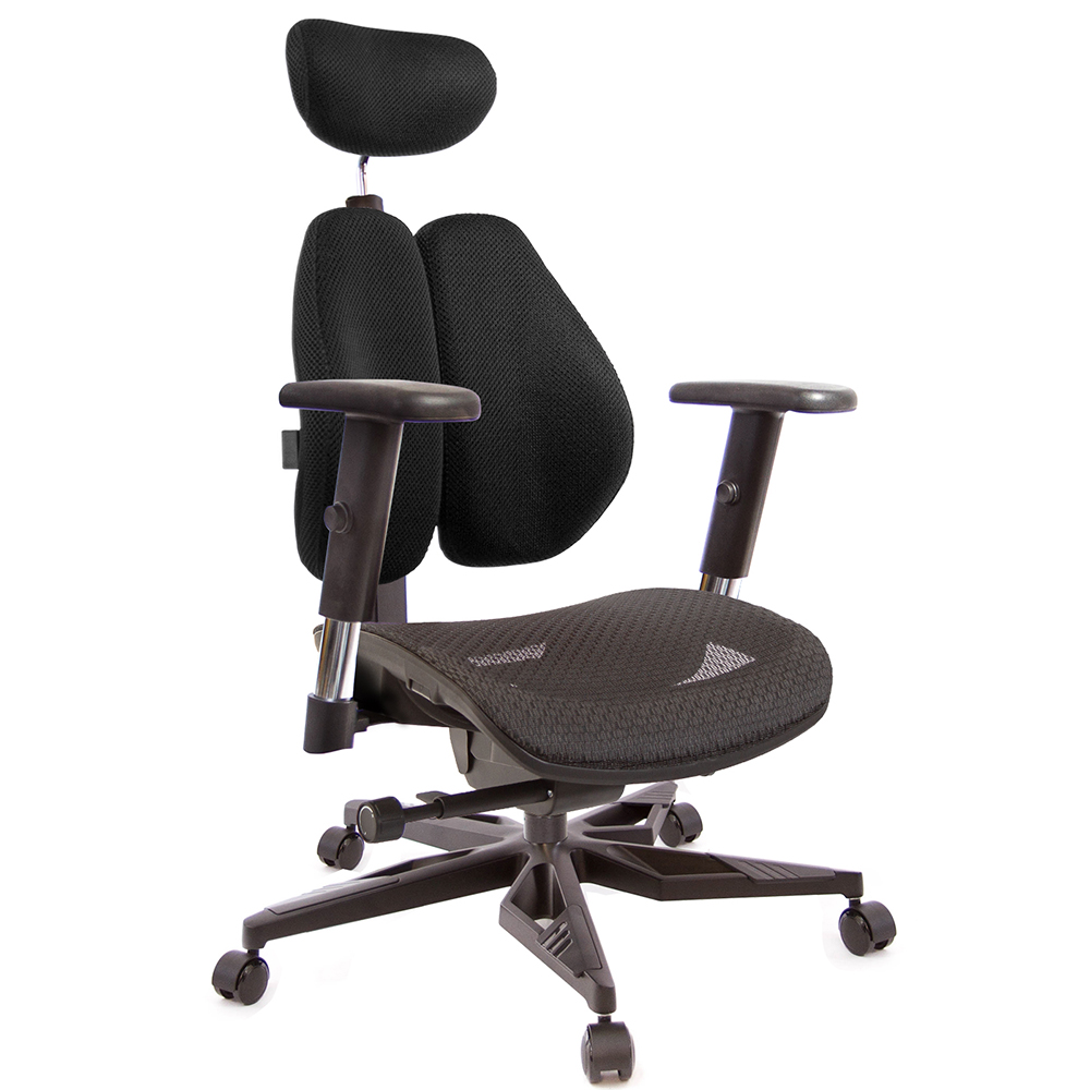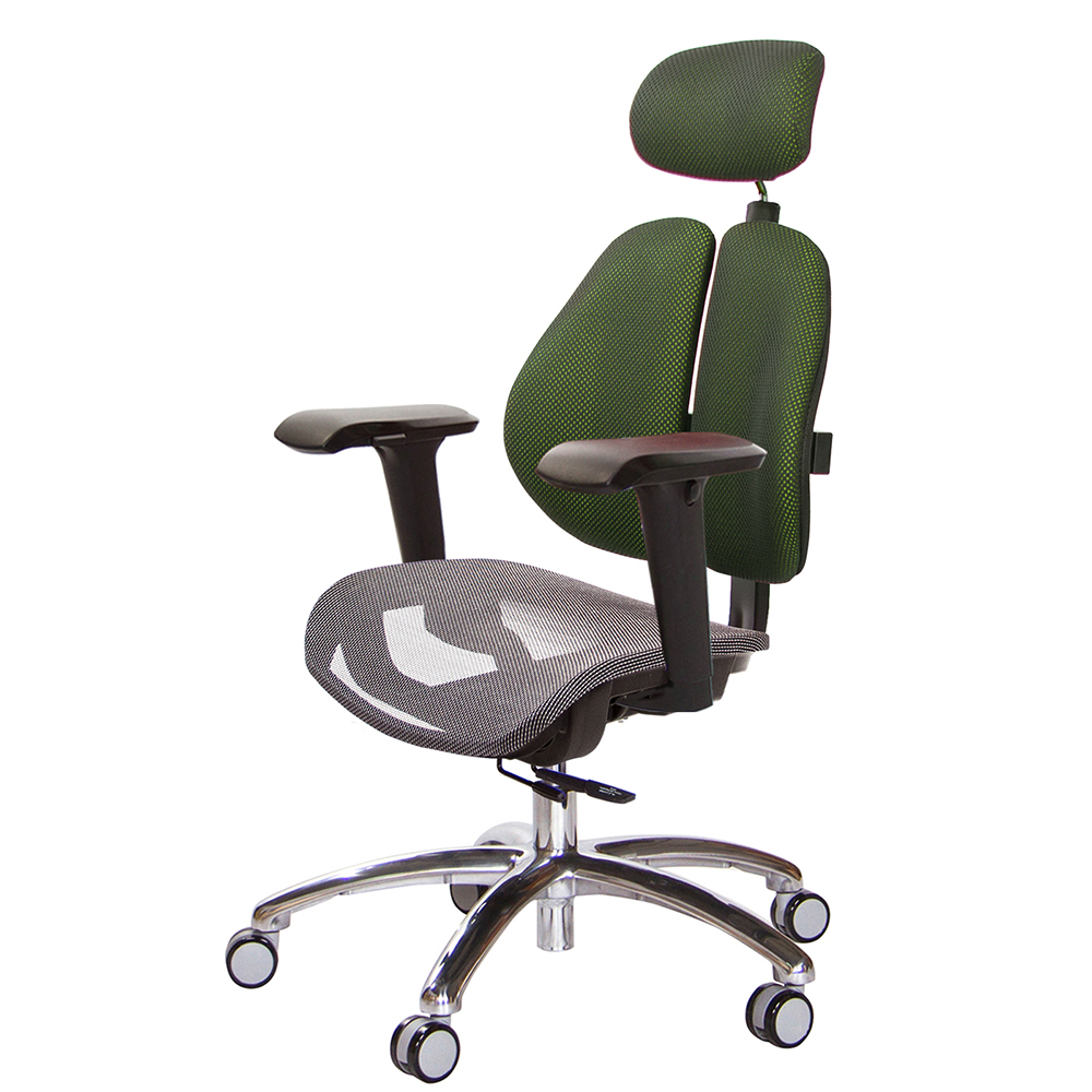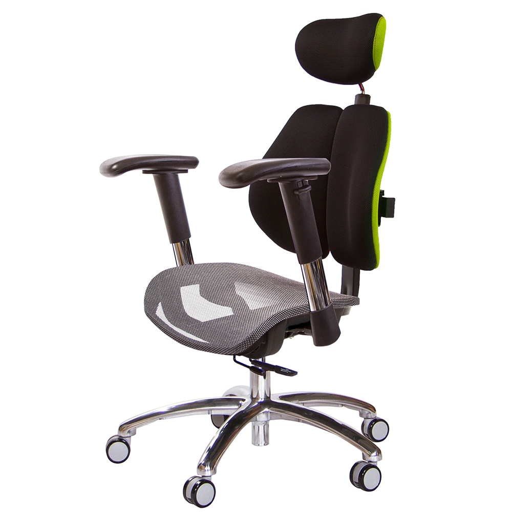 人體工學雙背設計,改善長時間座在椅子上,覺得腰部貼合度不足,有懸空或不夠沉穩的感覺,改良式的雙背背墊,除了完整包覆性外,更提供了『左右彈性』、『上下貼合』、『彈力緩衝』等特性,並有多國國際結構專利認證(台灣、德國、日本、美國、中國等),原廠專利、技術100% Made in Taiwan台灣製造。