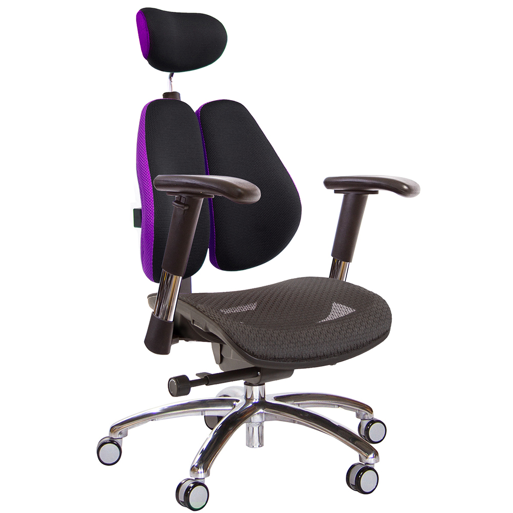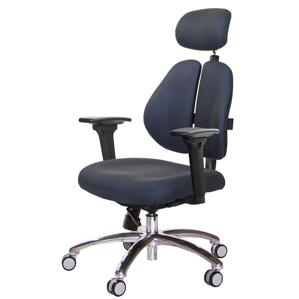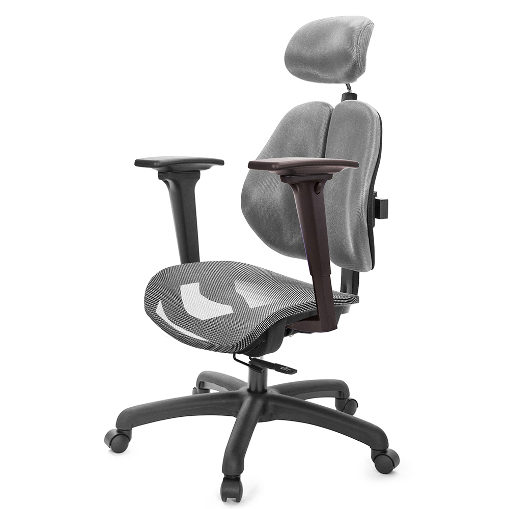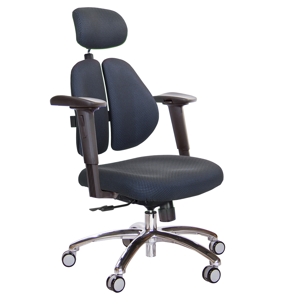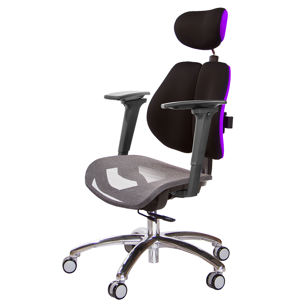 人體工學雙背設計,改善長時間座在椅子上,覺得腰部貼合度不足,有懸空或不夠沉穩的感覺,改良式的雙背背墊,除了完整包覆性外,更提供了『左右彈性』、『上下貼合』、『彈力緩衝』等特性,並有多國國際結構專利認證(台灣、德國、日本、美國、中國等),原廠專利、技術100% Made in Taiwan台灣製造。