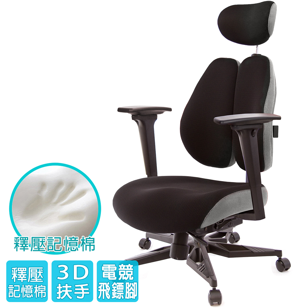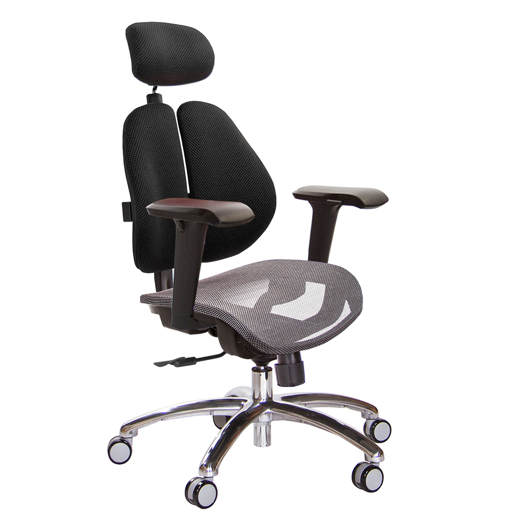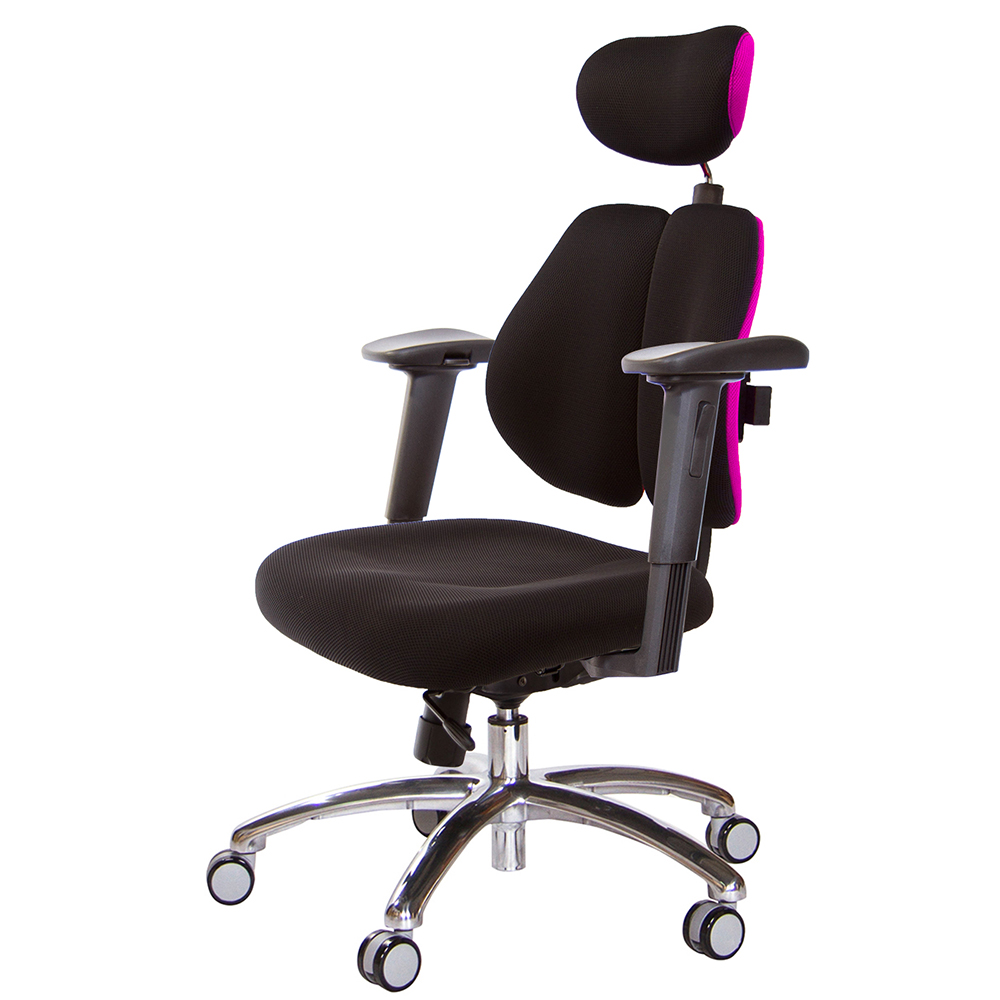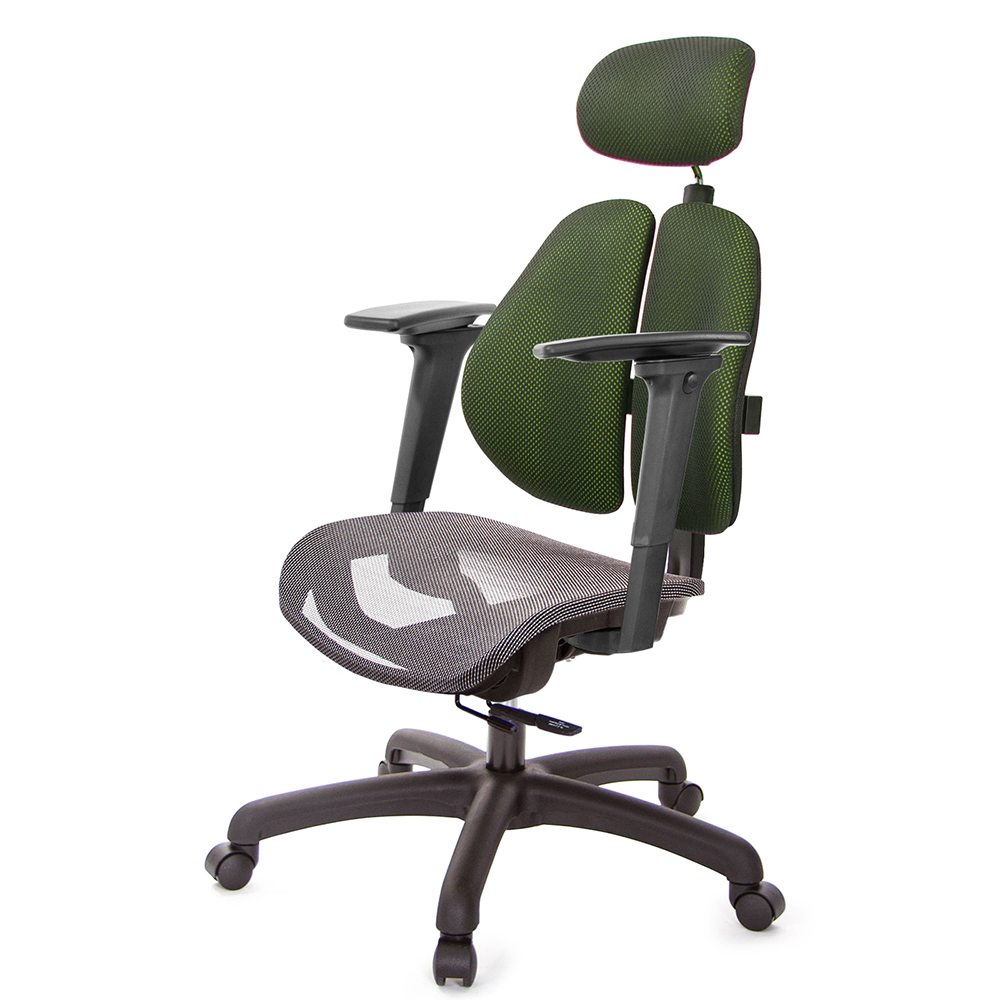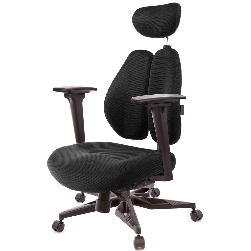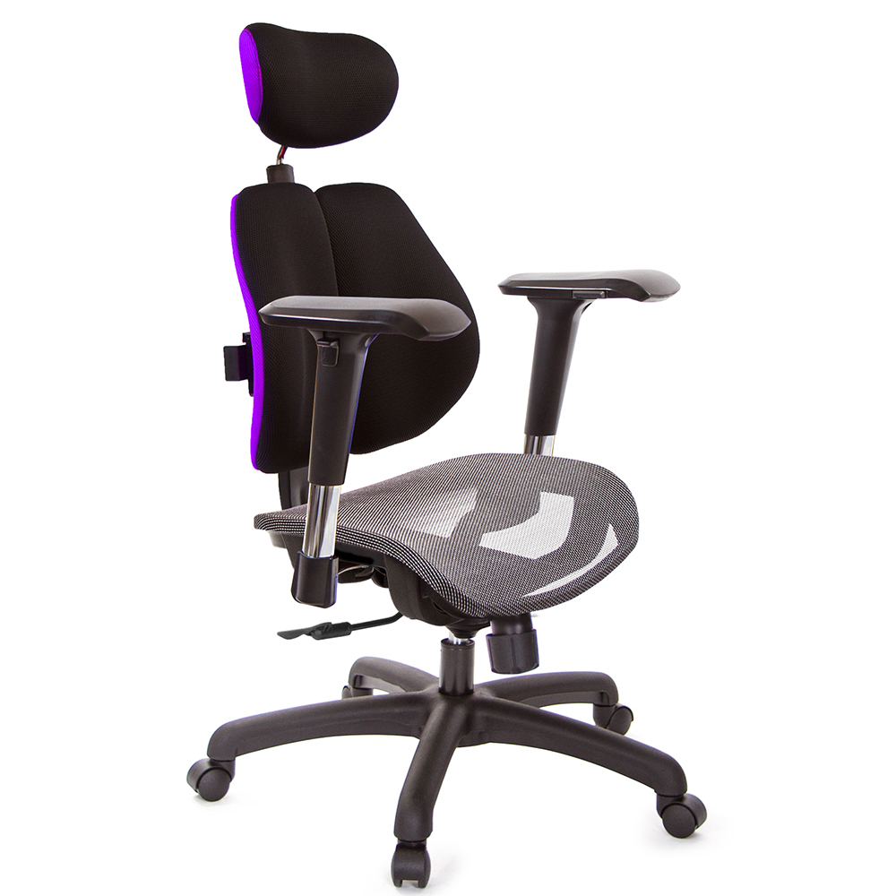 人體工學雙背設計,改善長時間座在椅子上,覺得腰部貼合度不足,有懸空或不夠沉穩的感覺,改良式的雙背背墊,除了完整包覆性外,更提供了『左右彈性』、『上下貼合』、『彈力緩衝』等特性,並有多國國際結構專利認證(台灣、德國、日本、美國、中國等),原廠專利、技術100% Made in Taiwan台灣製造。