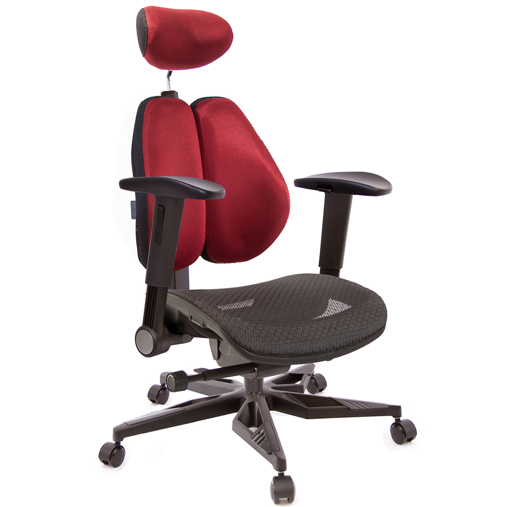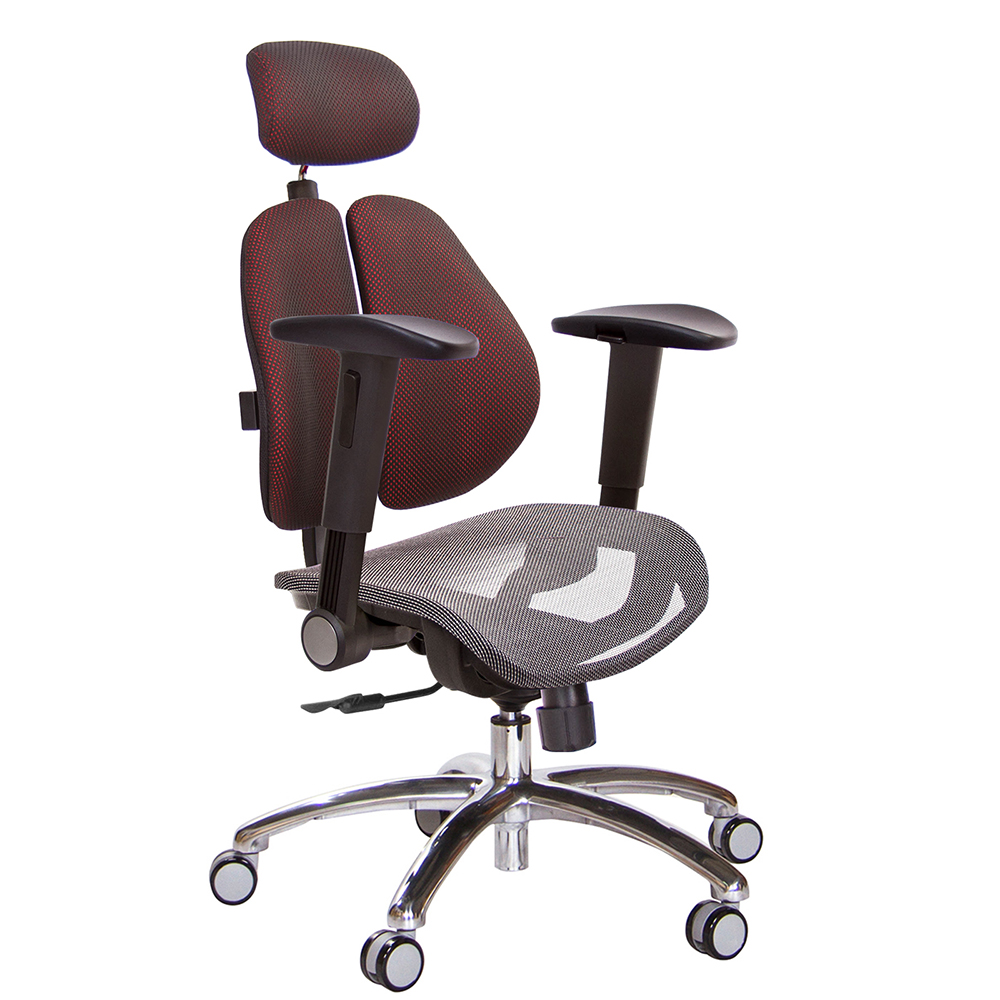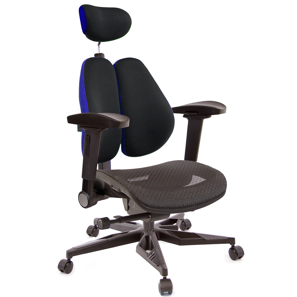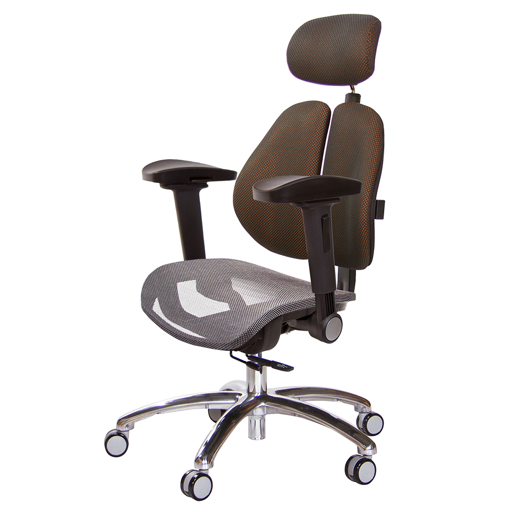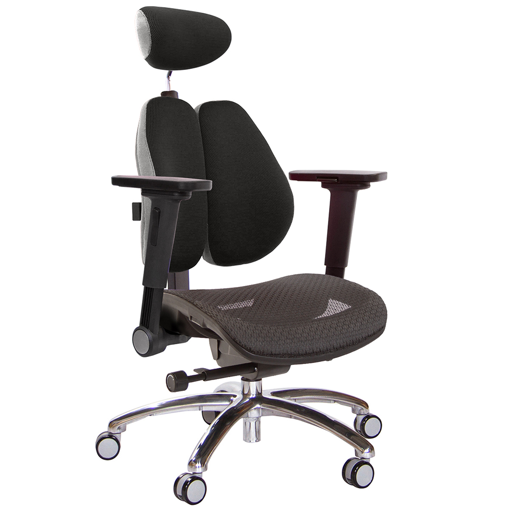 人體工學雙背設計,改善長時間座在椅子上,覺得腰部貼合度不足,有懸空或不夠沉穩的感覺,改良式的雙背背墊,除了完整包覆性外,更提供了『左右彈性』、『上下貼合』、『彈力緩衝』等特性,並有多國國際結構專利認證(台灣、德國、日本、美國、中國等),原廠專利、技術100% Made in Taiwan台灣製造。