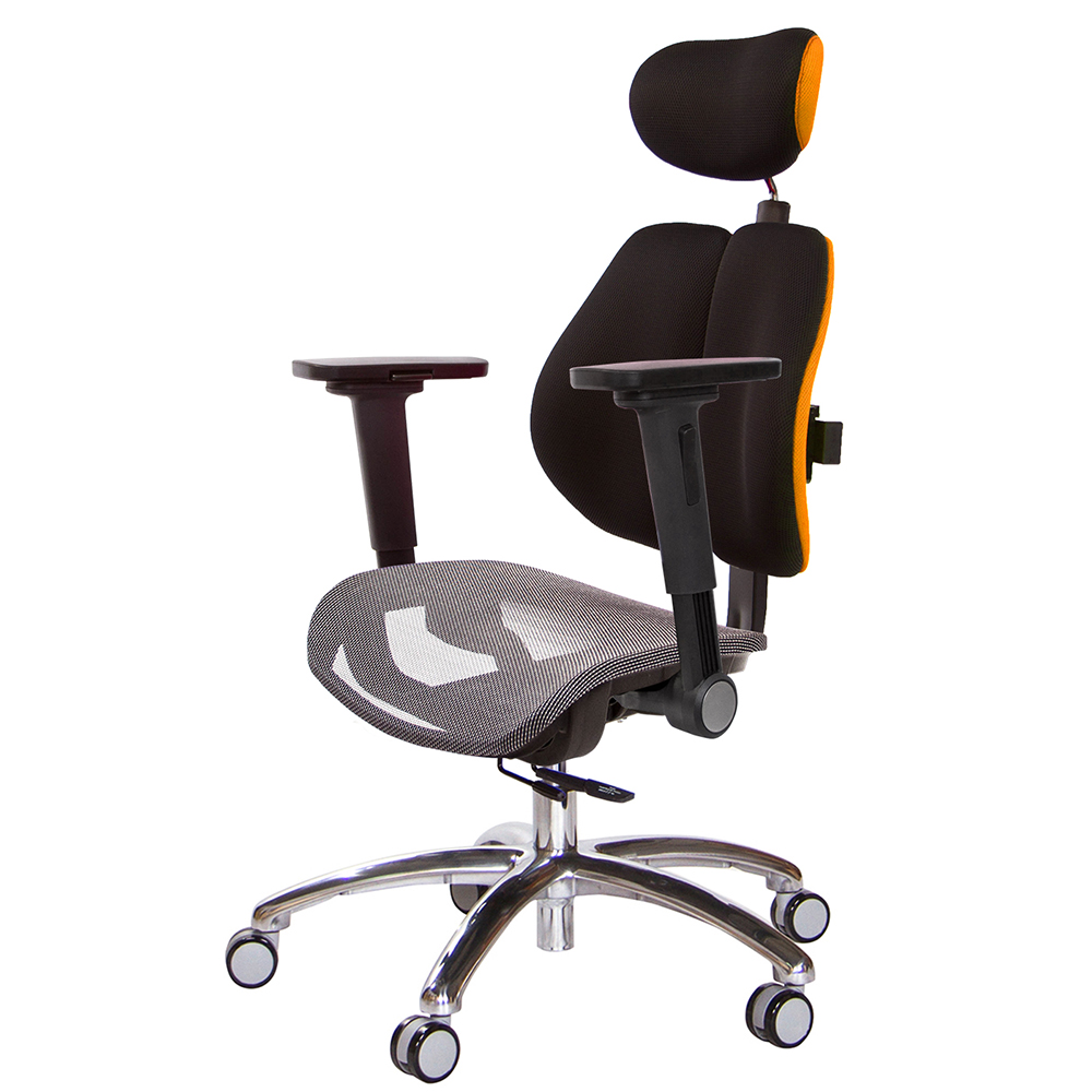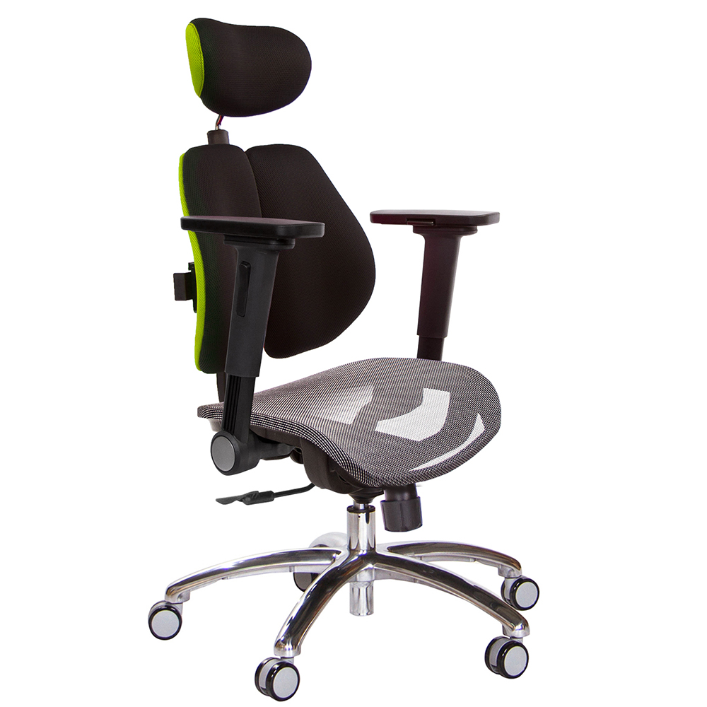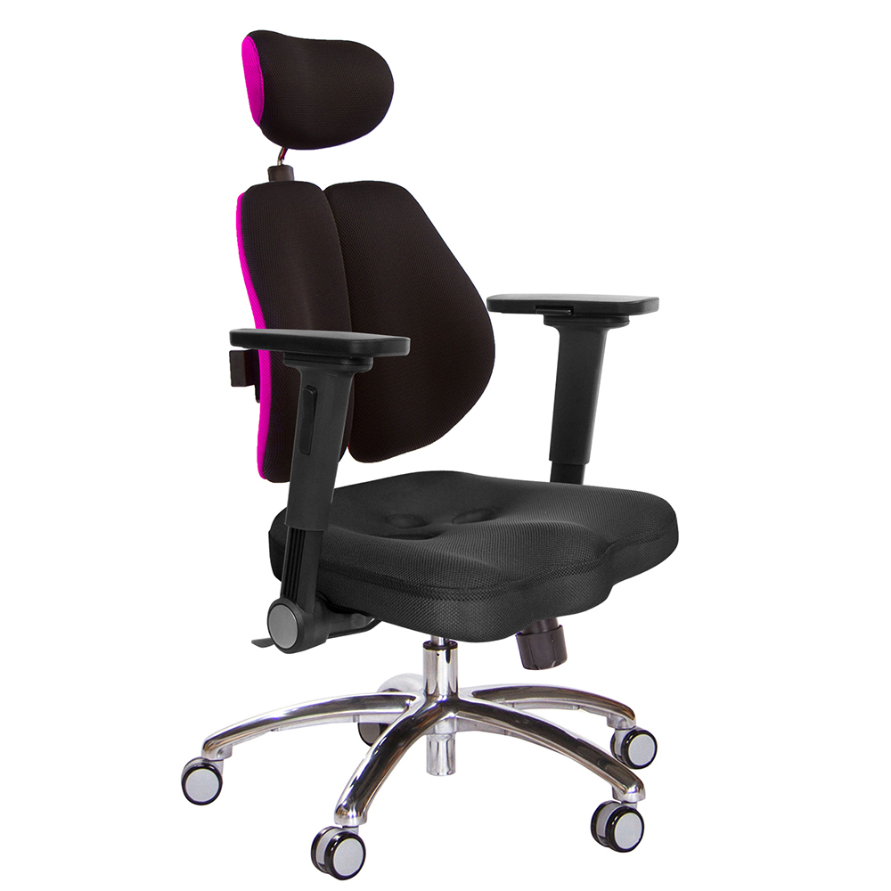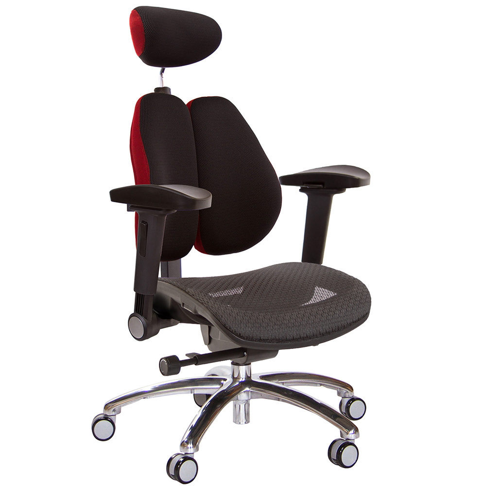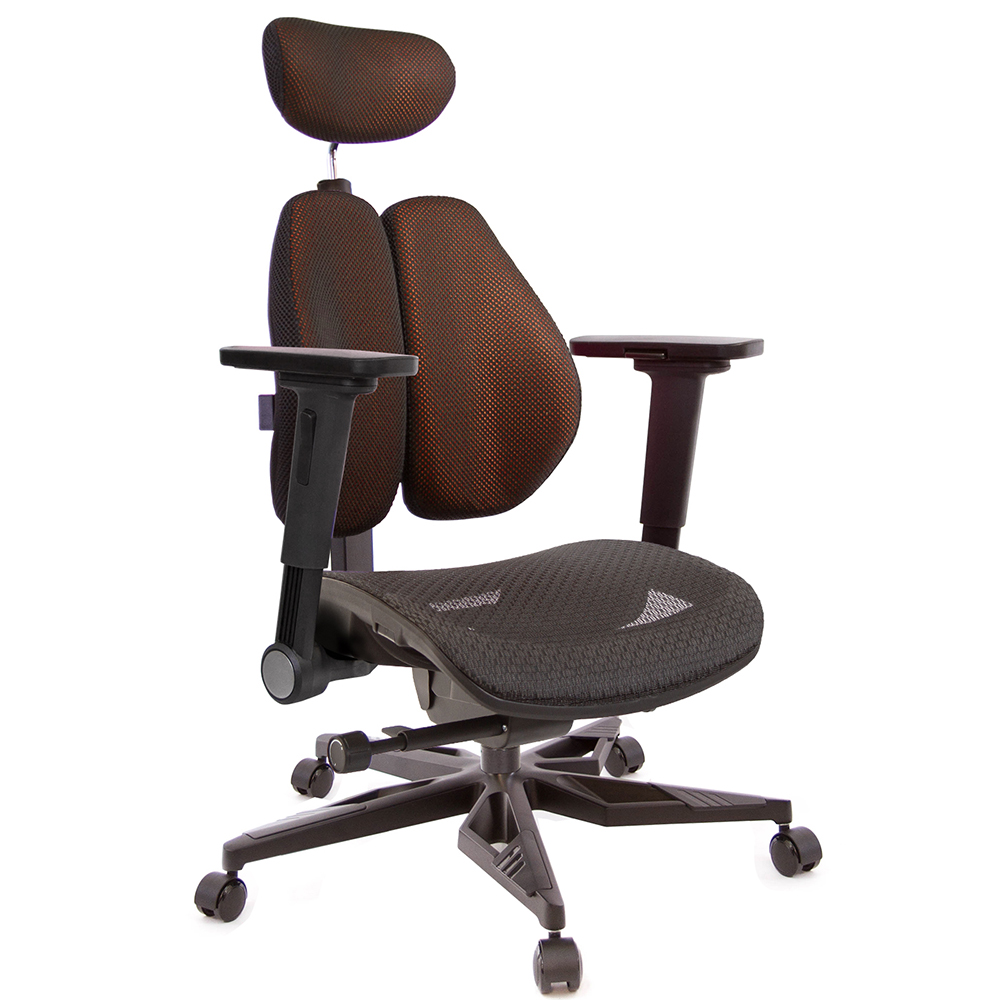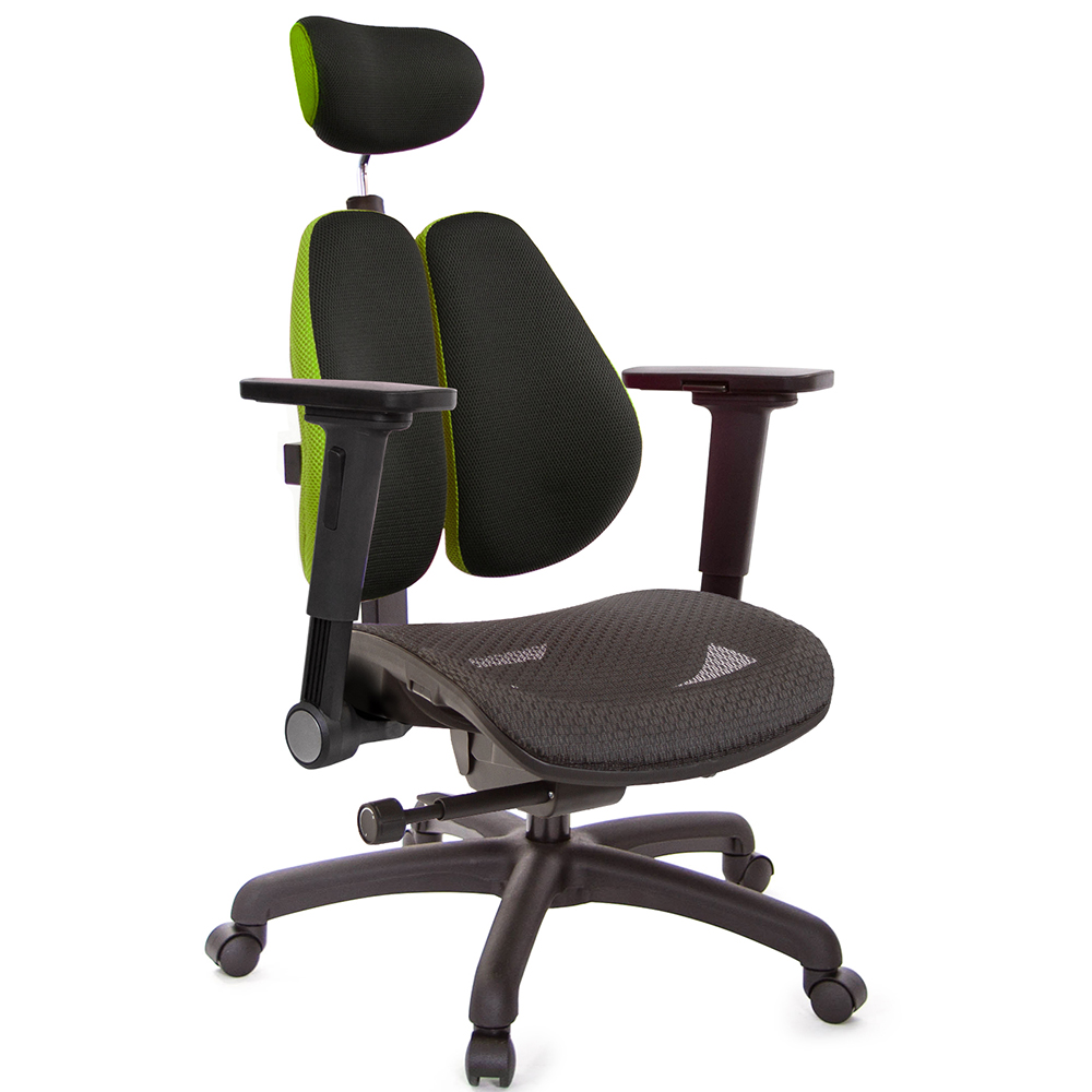 人體工學雙背設計,改善長時間座在椅子上,覺得腰部貼合度不足,有懸空或不夠沉穩的感覺,改良式的雙背背墊,除了完整包覆性外,更提供了『左右彈性』、『上下貼合』、『彈力緩衝』等特性,並有多國國際結構專利認證(台灣、德國、日本、美國、中國等),原廠專利、技術100% Made in Taiwan台灣製造。