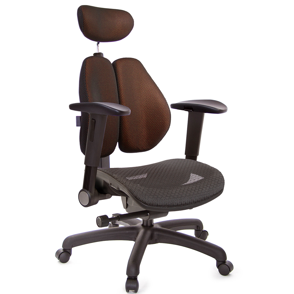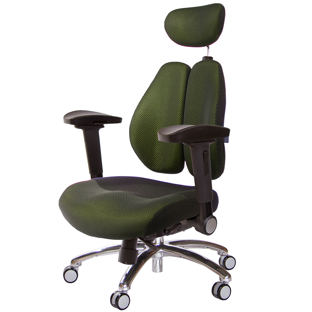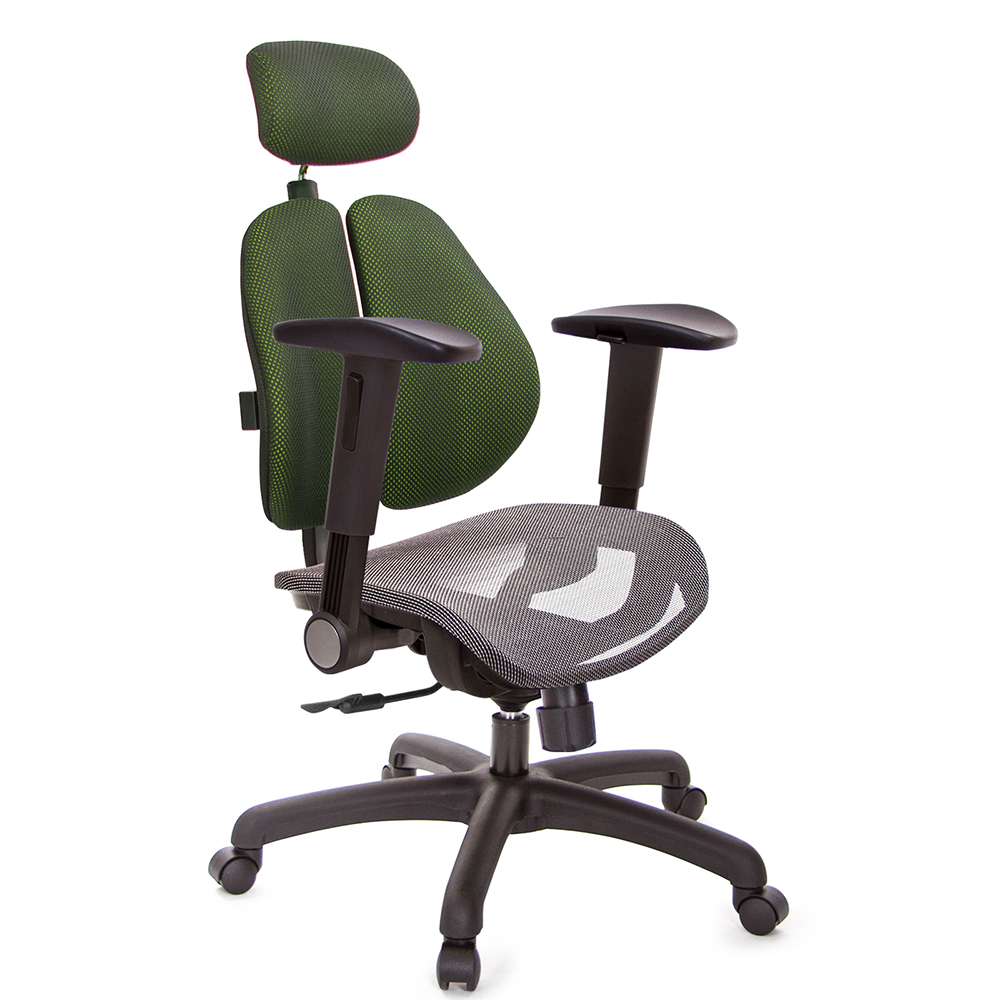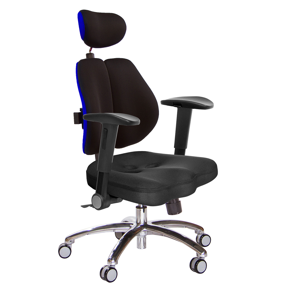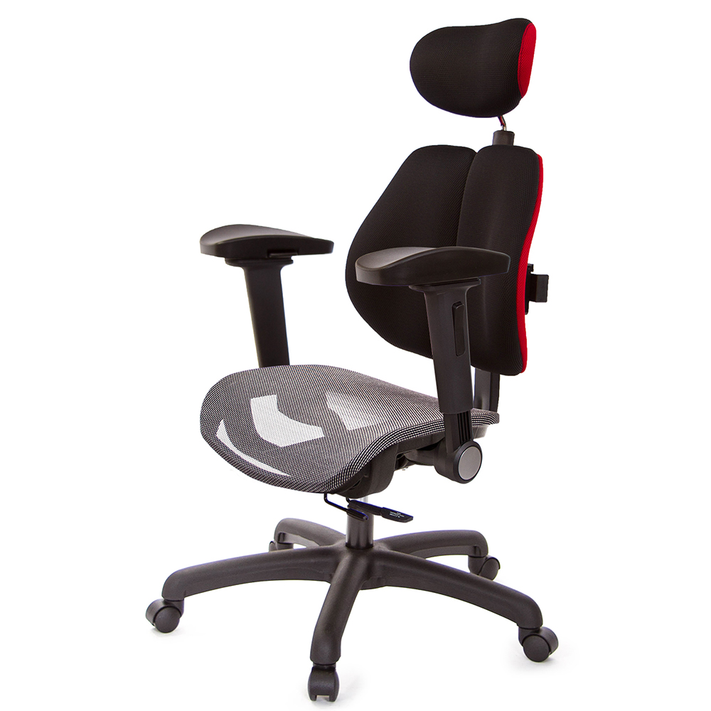 人體工學雙背設計,改善長時間座在椅子上,覺得腰部貼合度不足,有懸空或不夠沉穩的感覺,改良式的雙背背墊,除了完整包覆性外,更提供了『左右彈性』、『上下貼合』、『彈力緩衝』等特性,並有多國國際結構專利認證(台灣、德國、日本、美國、中國等),原廠專利、技術100% Made in Taiwan台灣製造。