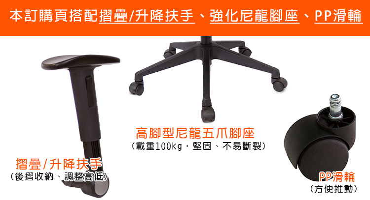 本訂購頁規格:升降折疊扶手、尼龍高腳座、PP滑輪